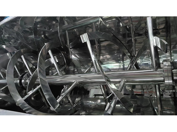WLDH系列混合機(jī)的攪拌器主軸上,通常采用盤(pán)繞兩組方向相反的內(nèi)、外雙層螺帶,工作時(shí),快速攪拌物料。物料同時(shí)被外層螺帶向筒體中心推送,和被內(nèi)層螺帶向筒體兩側(cè)推送,形成循環(huán)交錯(cuò)的對(duì)流,最終實(shí)現(xiàn)混合效果。對(duì)流動(dòng)性較差的物料,可設(shè)計(jì)刮片解決了傳統(tǒng)臥式螺帶混合機(jī)死角的問(wèn)題。開(kāi)機(jī)出料保證物料被外層螺帶向筒體中心推送從而保證出料干凈。