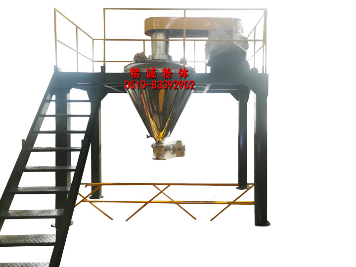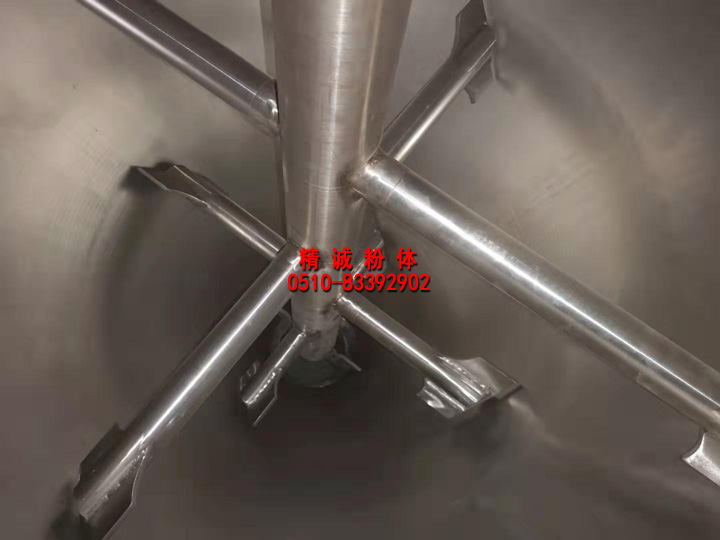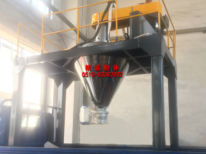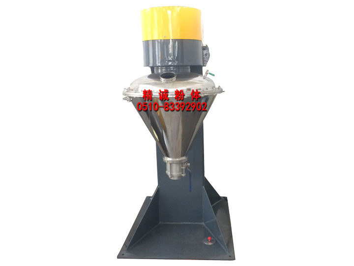 產(chǎn)品通過錐形混合腔頂部投入,投料范圍在30%-99.99%之間,設備中間有一個頂部驅(qū)動的高速轉(zhuǎn)軸,因此便去除了在產(chǎn)品區(qū)域的密封設計以及軸承。在軸上有緊貼內(nèi)壁的槳式混合原件。通過高速旋轉(zhuǎn)的攪拌槳和錐形內(nèi)倉的共同作用將產(chǎn)品由底部帶至混合腔的上部。當產(chǎn)品達到頂部的時候又重新回落到混合倉中心,如此的產(chǎn)品的方式形成了一種快速的宏觀混合。