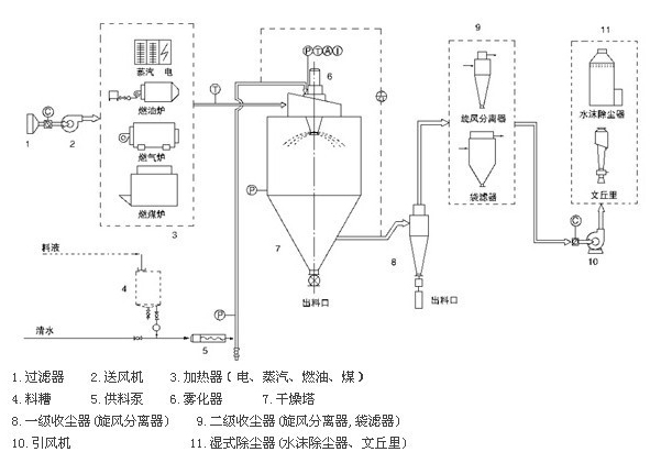 空氣通過過濾器和加熱器,進入干燥器頂部的空氣分配器,熱空氣呈螺旋狀均勻進入干燥器。料液由料液槽經(jīng)過濾器由泵送至干燥器的離心霧化器,使料液噴成小的霧狀液滴,料液和熱空氣并流接觸水分迅速蒸發(fā),在短時間內(nèi)干燥為粉末狀成品。成品由干燥塔和旋風分離器排除,廢氣由風機排出。