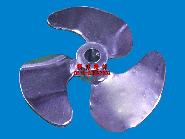 旋槳式攪拌器由2~3片推進式螺旋槳葉構成,工作轉(zhuǎn)速較高,葉片外緣的圓周速度一般為5~15m/s。旋槳式攪拌器主要造成軸向液流,產(chǎn)生較大的循環(huán)量,適用于攪拌低粘度(<2Pa·s)液 體、乳濁液及固體微粒含量低于10%的懸浮液。攪拌器的轉(zhuǎn)軸也可水平或斜向插入槽內(nèi),此時液流的循環(huán)回路不對稱,可增加湍動,防止液面凹陷。
